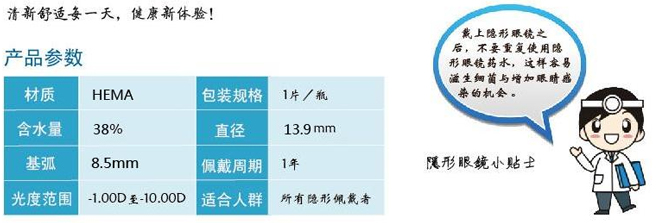 產品說明:★模壓技術,鏡片材料清透,透光率高,提供優質視覺環境,視物輕松清晰 ★內含獨特保濕因子,鏡片長時間維持濕潤,令每日配戴倍感舒適潤澤